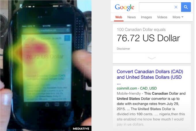 在最近的眼動分析研究中,Mediative邀請了49位不同性別、年齡的測試者。要求他們在iPhone 5上使用谷歌完成共計41項搜索任務。我們使用了X2-60 Tobii移動設備眼動跟蹤器來監測參與者注意到了屏幕的哪些區域,首次注意的時長,看過的人數和不同位置的點擊人數。