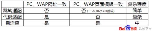 用戶通過移動設備訪問站點的PC頁時,站點將其自動適配到該PC頁面對應的手機頁,並為之選擇合適的頁面版本。站長應選擇適合自己網站的自主適配方式。目前自主適配主要有三種實現方式:跳轉適配、代碼適配、自適應,其各自的特點如下: