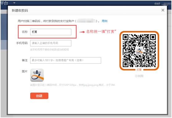 第三步:填寫相關信息,點擊創建,為保證用戶體驗一致,名稱必須統一填“打賞”