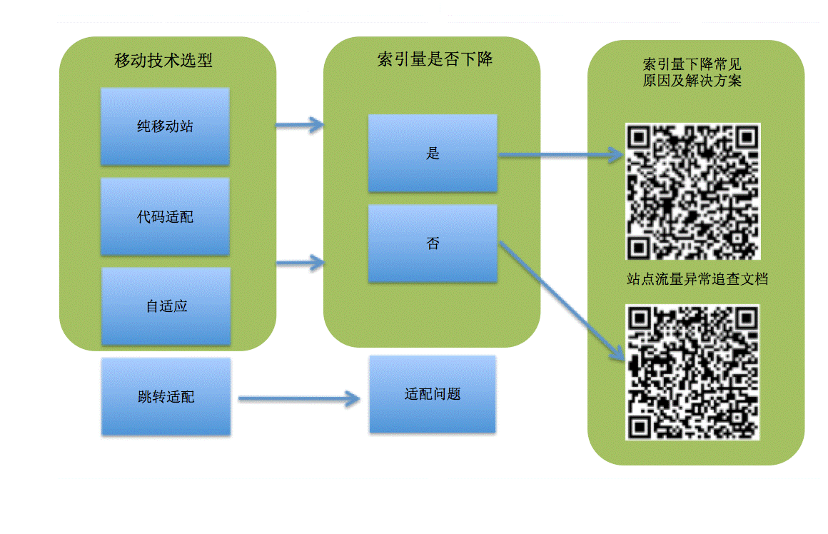 純移動站、代碼適配,自適應與跳轉適配有些不同,所以根據站長平台的索引量工具來判斷,索引量下跌並流量下跌,可以先從索引量下降常見原因進行排查,如果索引量無變化可以看之前發布的PC流量異常追查文檔