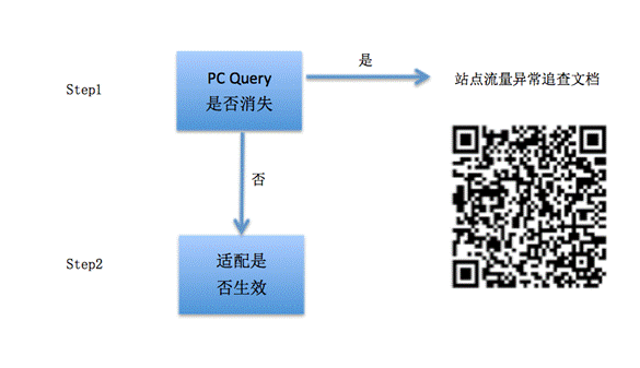 跳轉適配由PC鏈接和移動鏈接作為對應關系,移動展現會有繼承PC展現因素,所以先要判斷一下同Query在PC端排名是否消失,如果PC端消失必定會對移動端有連帶影響,這部分可以先看PC流量異常追查文檔,根據這個來進行排查。