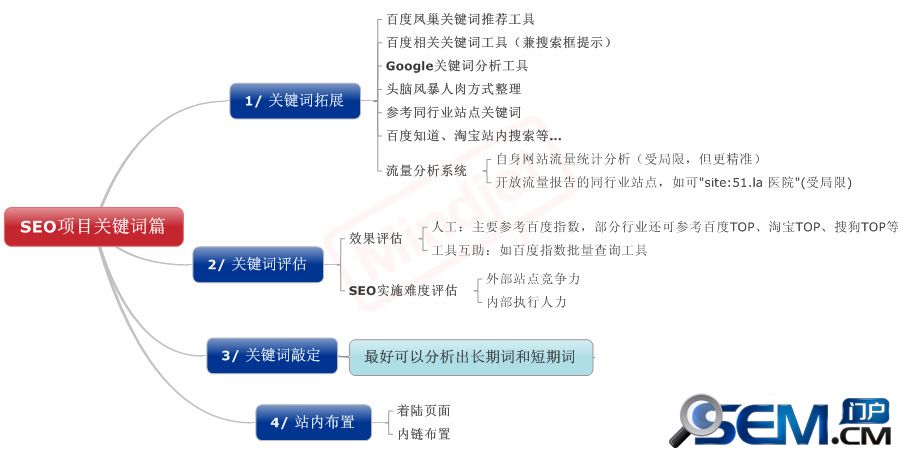 SEO項目中關鍵詞工作主要有SEOer人員親自完成,但同時也需要其它不同部門人員的配合和幫助,我總結了以下四點,基本上可以通用各種行業大小網站:1、關鍵詞拓展;2、關鍵詞評估;3、關鍵詞敲定;5、站內布置