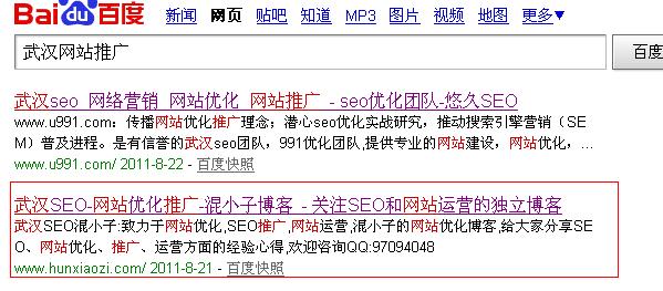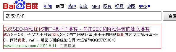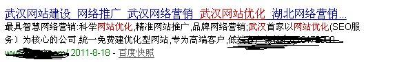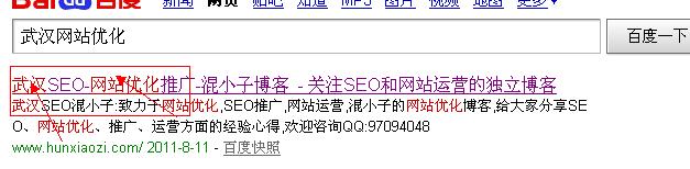 我博客裡面並沒有武漢網站優化這個整體詞,但是排名是第一,下面這個網站title大家可以仔細看下,幾乎每個詞都帶上武漢,這樣關鍵詞做的也少,而且顯得啰嗦,排名也不咋地(這個也跟本身權重有關系)