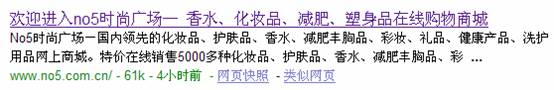 上述網站頁面所帶有No5的鏈接,都是http://www.no5.com.cn 的首頁鏈接,使網站權重分布不平衡;而且鏈接的描文字基本上都是使用“No5化妝品網、No5時尚廣場”這類詞義泛泛的文字,不能為網站本身產品提供針對性的鏈接描述,導致在產品關鍵詞排名上明顯弱於其他競爭對手。