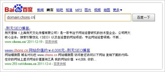 可以通過在搜索引擎中輸入:domain:+域名,或者是link:+域名來查詢反鏈。例如:在百度中搜索domain:chons.cn或link:chons.cn,如下圖所示: