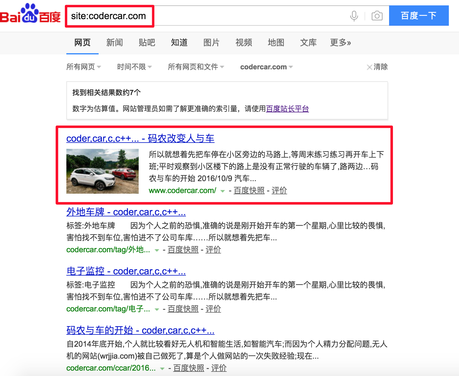 比如:www.codercar.com和codercar.com有跳轉關系,搜索site:codercar.com沒有鏈接為coder.com的結果頁。