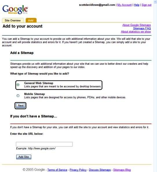 在“Add a Sitemap”頁面允許添加一個一般的或移動站點(我在本文中沒有涉及移動站點),甚至提供位置使用站點圖的特征而不需要創建完全的站點。在我的示例中,對於大多數的網絡站點,都選擇“General Web Sitemap”然後點擊下一步“next”按鈕。