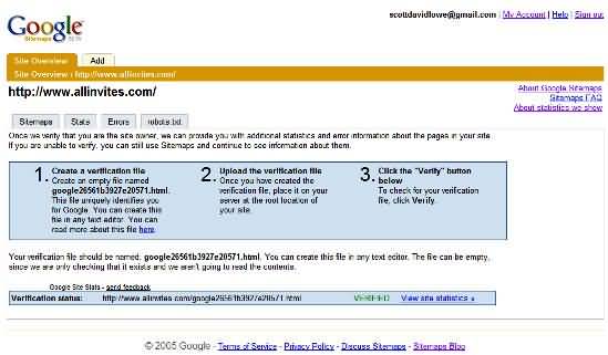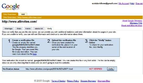 你可能很想知道Google在個人惡意使用可選方法對一個不屬於他的站點提交站點圖時是如何保護你的站點的(可選方法在下文中將會解釋)。為了防止這種欺騙行為,Google要求在顯示任何新站點的統計信息之前驗證站點。在圖E中,注意到“Verify(驗證)”鏈接到一個新添加的站點。點擊此在你站點圖帳戶上鏈接開始驗證過程。
