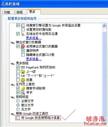 在設置選項中”向Google發送使用統計信息”,用戶可以選擇自己電腦上Google 工具欄是否向 Google 自動發送標准的、數量有限的信息。而Google官方網站也指出:“這些信息可能會保留在 Google 的服務器日志中。除非您啟用工具欄的高級功能,否則工具欄不會發送任何有關您訪問網頁的信息(如網址)。”