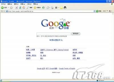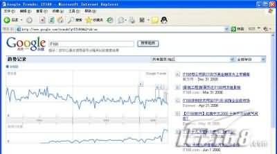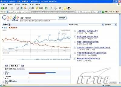 谷歌趨勢可以指定在特定的國家/地區,也可以指定從2004年1月至2006年6月中的某年某月,查看對關鍵詞“IT168”的搜索趨勢。