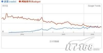 谷歌趨勢還可以使用兩個或兩個以上關鍵詞做比較,例如“迅雷”和“網際快車”。